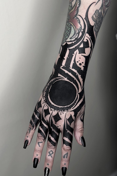 Tatuoija Dogma Noirin tekemä blackwork tatuointi asiakkaan käsissä.