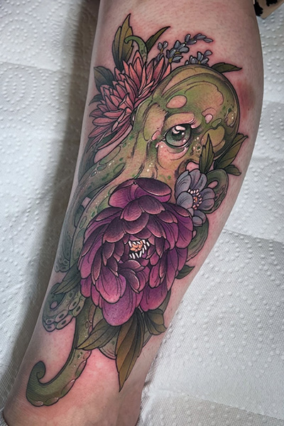 “Rakastan tehdä eläin- ja fantasiateemoja neotraditional-tyylillä. Inspiraationi tulee luonnosta, jugend-tyylistä, fantasiakirjoista, elokuvista ja peleistä. Nautin lemmikki-potrettien tatuoimisesta, sillä ihailen ihmisen ja eläimen luomaa suhdetta toisiinsa.”
