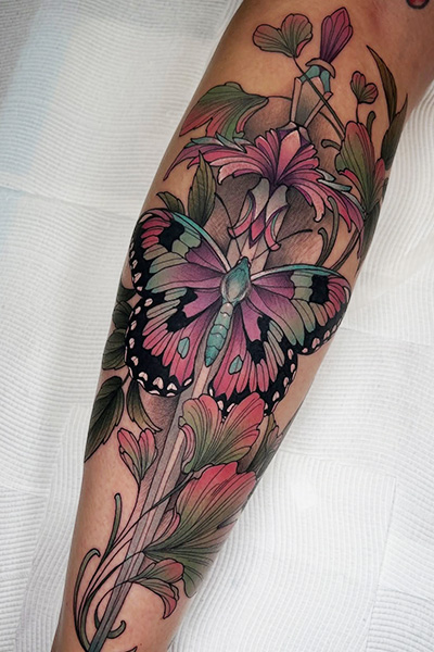 Tatuoija Sam Readin tekemä neotradtional-tatuointi perhosesta.